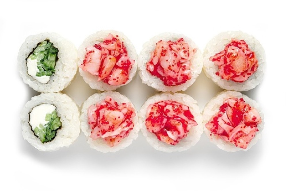Тигровые креветки, икра летучей рыбы, сыр творожный, соус манго чили, огурец, рис, нори.