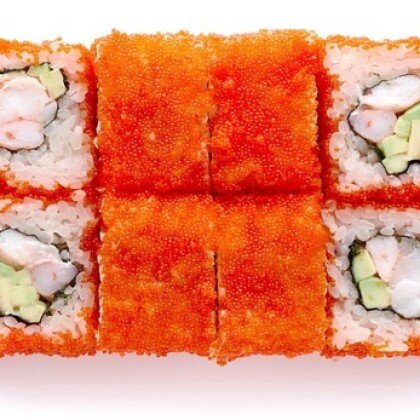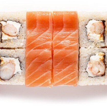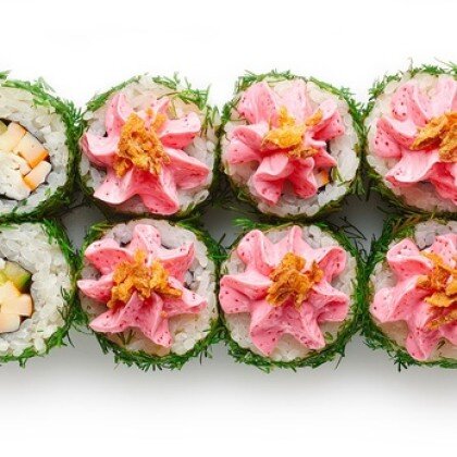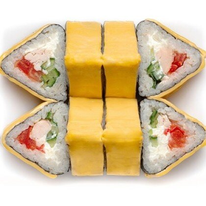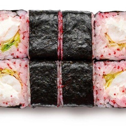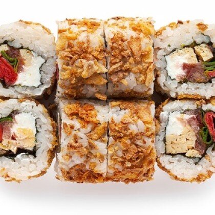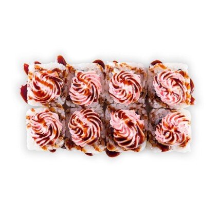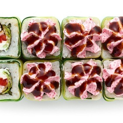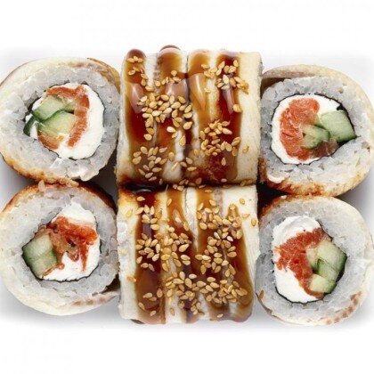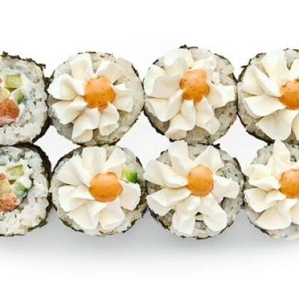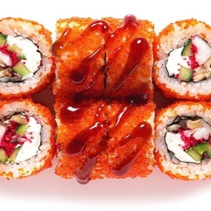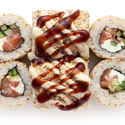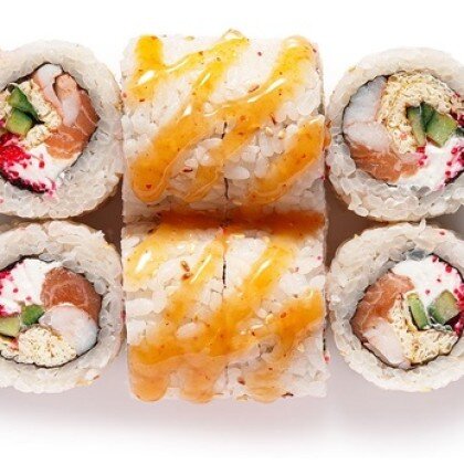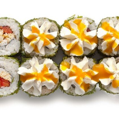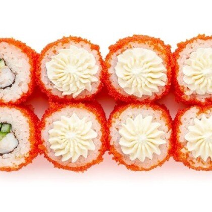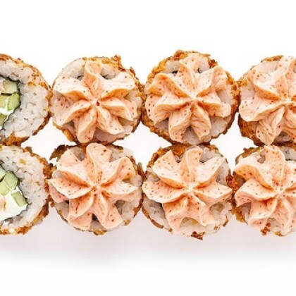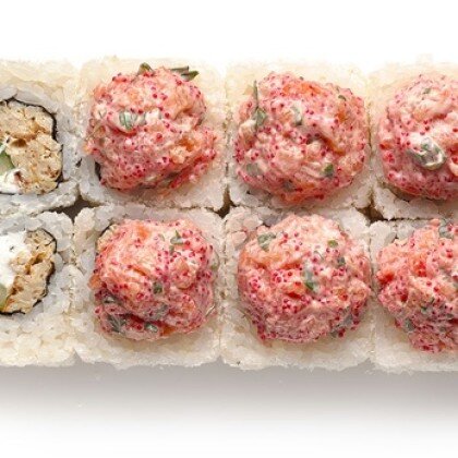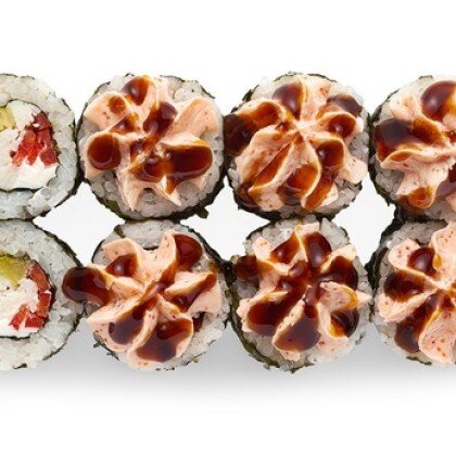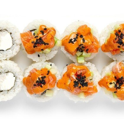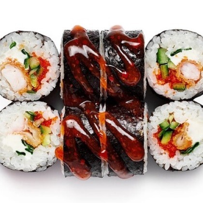Тигровые креветки, сыр сливочный, соус «Спайси», рис, нори.