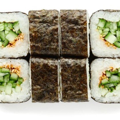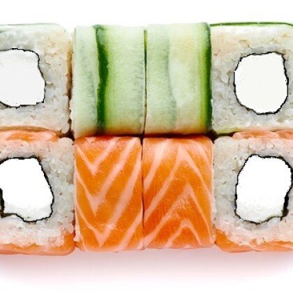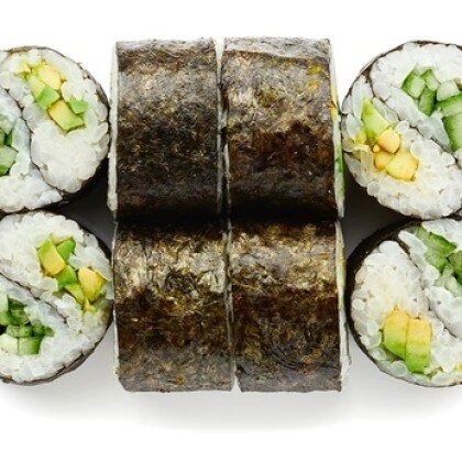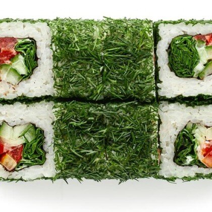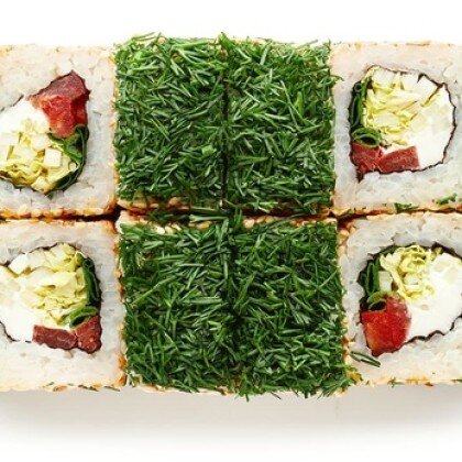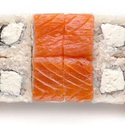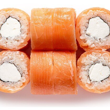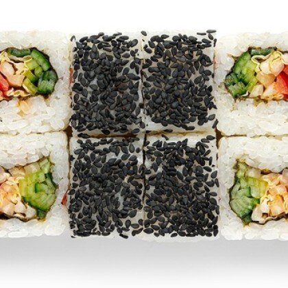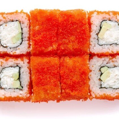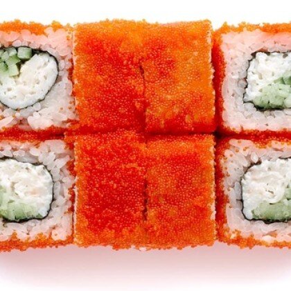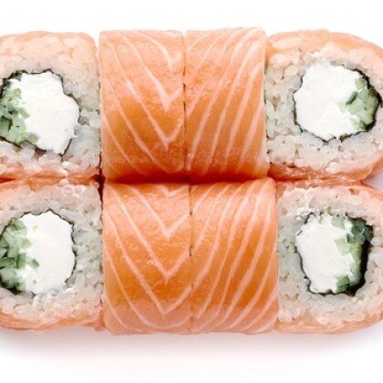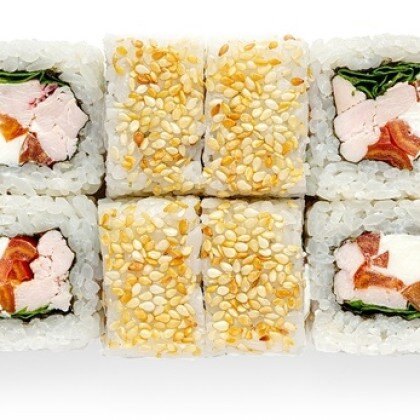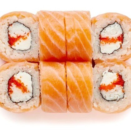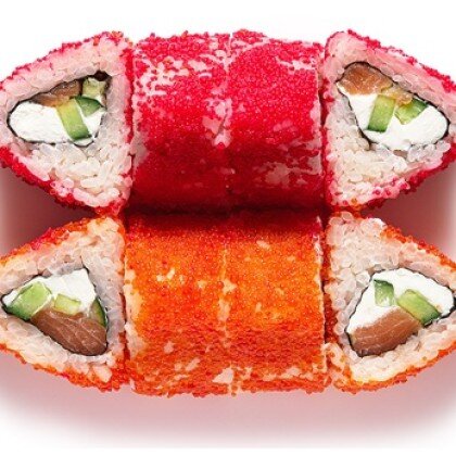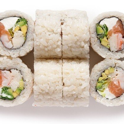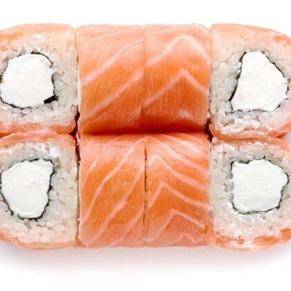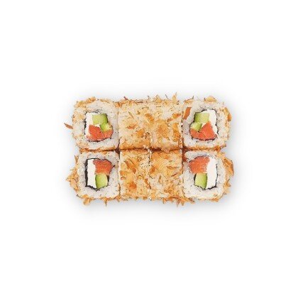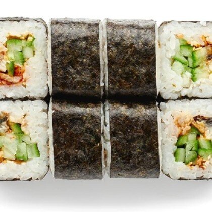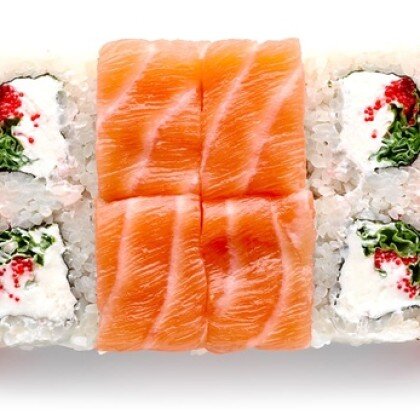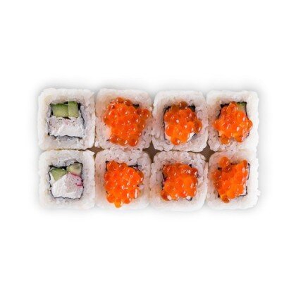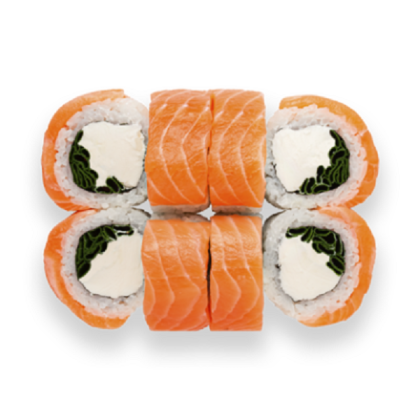 Тигровые креветки, сыр сливочный, соус «Спайси», рис, нори.