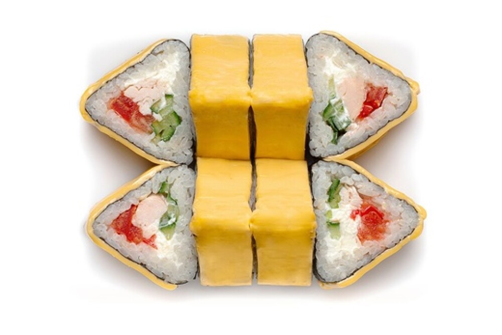 Копченая курица, сыр «Чеддер», сливочный сыр, огурец, помидор, рис, нори.