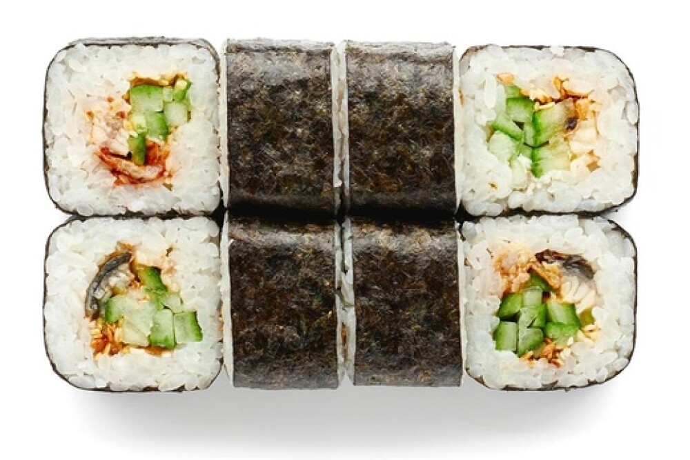 Угорь, огурец, кунжут, рис, нори.