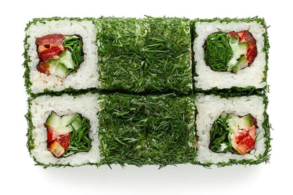 Пекинская капуста, помидор, огурец, укроп, сыр сливочный, рис, нори.