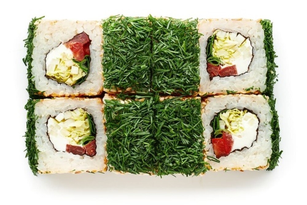 Томаты, зеленый лук, укроп, кунжут, пекинская капуста, сливочный сыр, рис, нори.