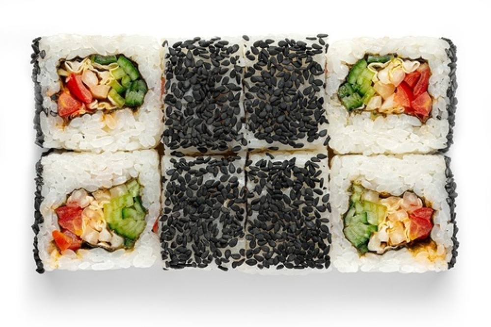 Пекинская капуста, огурец, помидор, соус спайси, кунжут черный, рис, нори.