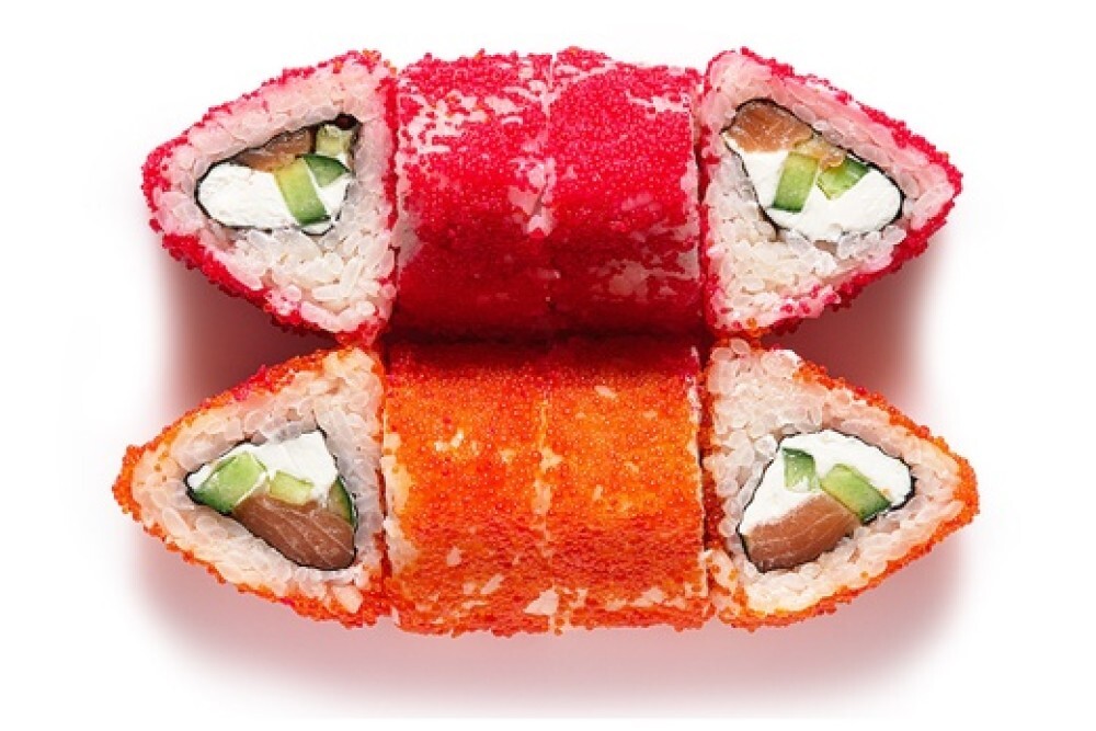 Лосось, сливочный сыр, огурец, в икре летучей рыбы, рис, нори.