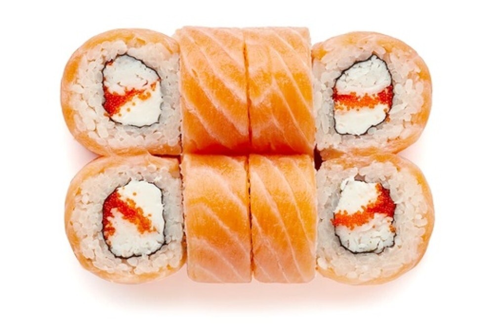 Лосось, сурими (имитацией мяса краба), икра летучей рыбы, сливочный сыр, рис, нори.