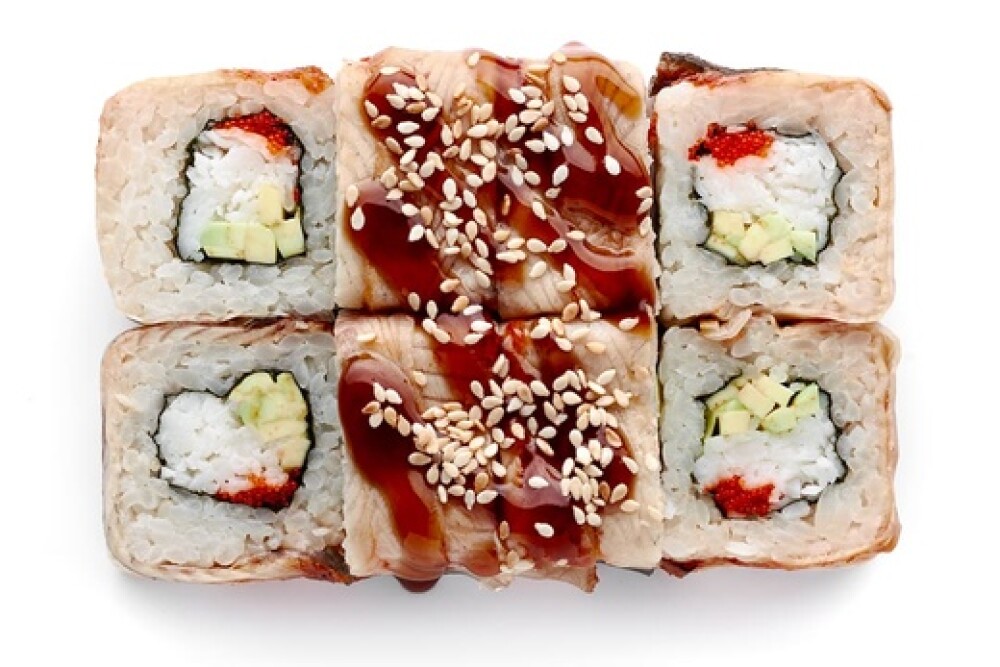 Рис, нори, сыр сливочный, угорь, сурими (имитацией мяса краба), икра летучей рыбы, авокадо.