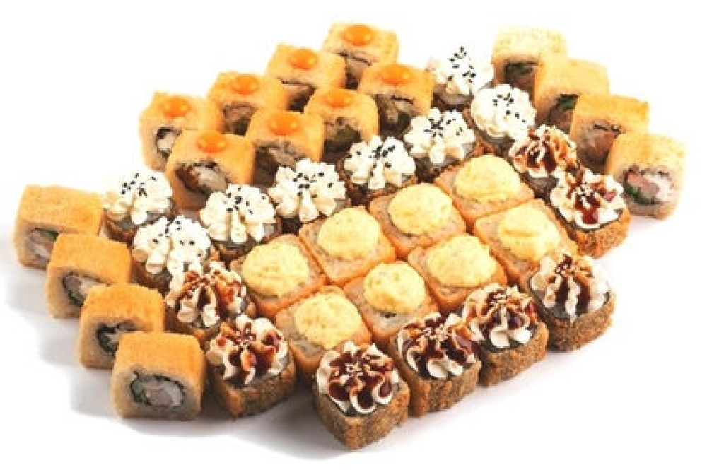 5 роллов, 40 шт. Эби маки с креветкой, Сливочный лосось, Филадельфия с угрем и соусом унаги, Чикен с курочкой хк, Беконаизер с беконом и соусом спайси.
