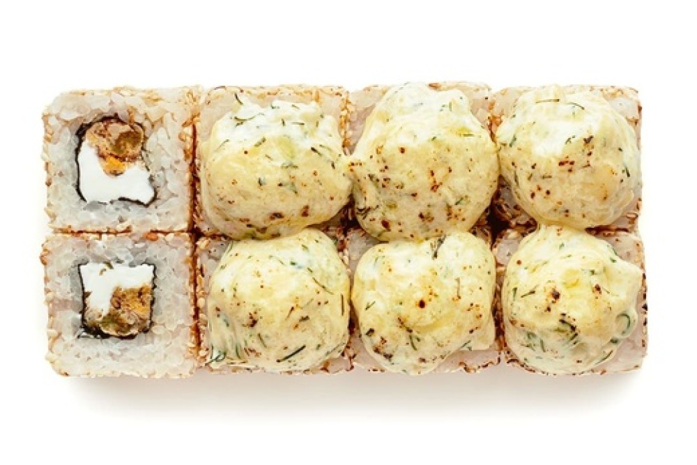 Мидии, сливочный сыр, кунжут, соус «Майонезно-чесночный», рис, нори.