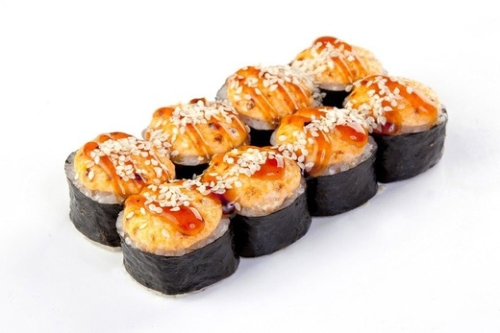 Курица копченая, сыр сливочный, огурец, шапка сырная, соус «Унаги», кунжут, рис, нори.