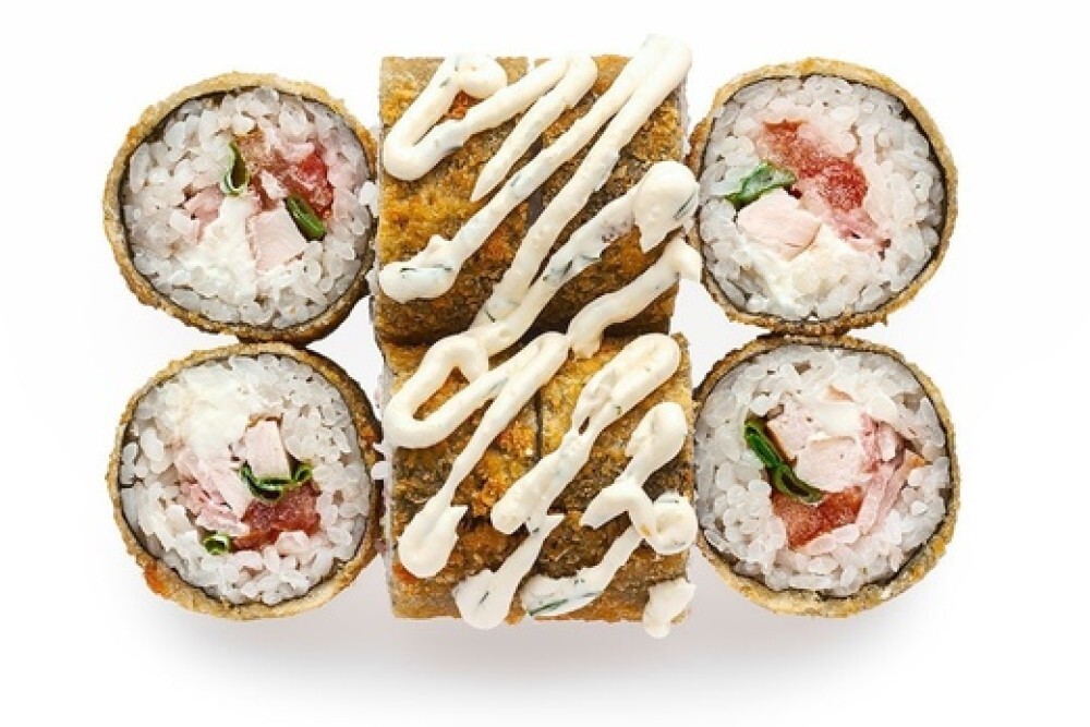 Курица копченая, бекон, сыр творожный, помидор, лук зеленый, панировочные сухари, соус «Майонезно-чесночный», рис, нори.
