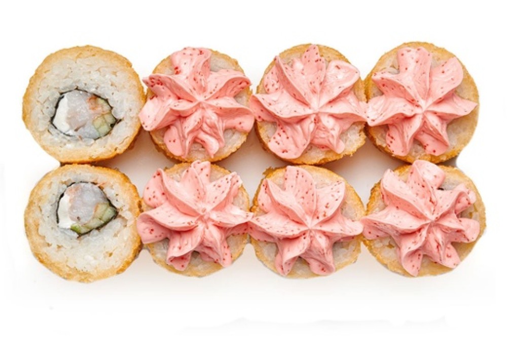 Креветки, огурец, сливочный сыр, соус «Лава», рис, нори.