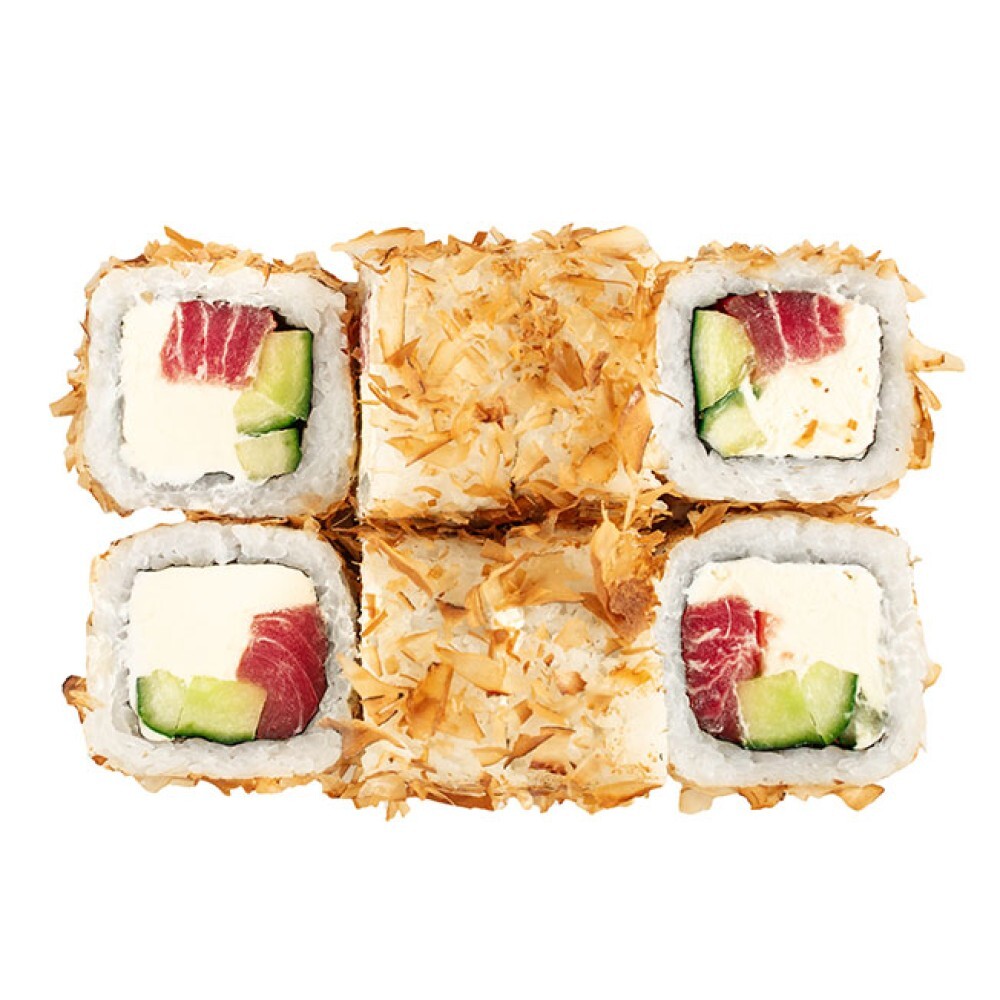 Филе тунца, сыр сливочный, огурец, рис, нори, стружка тунца.