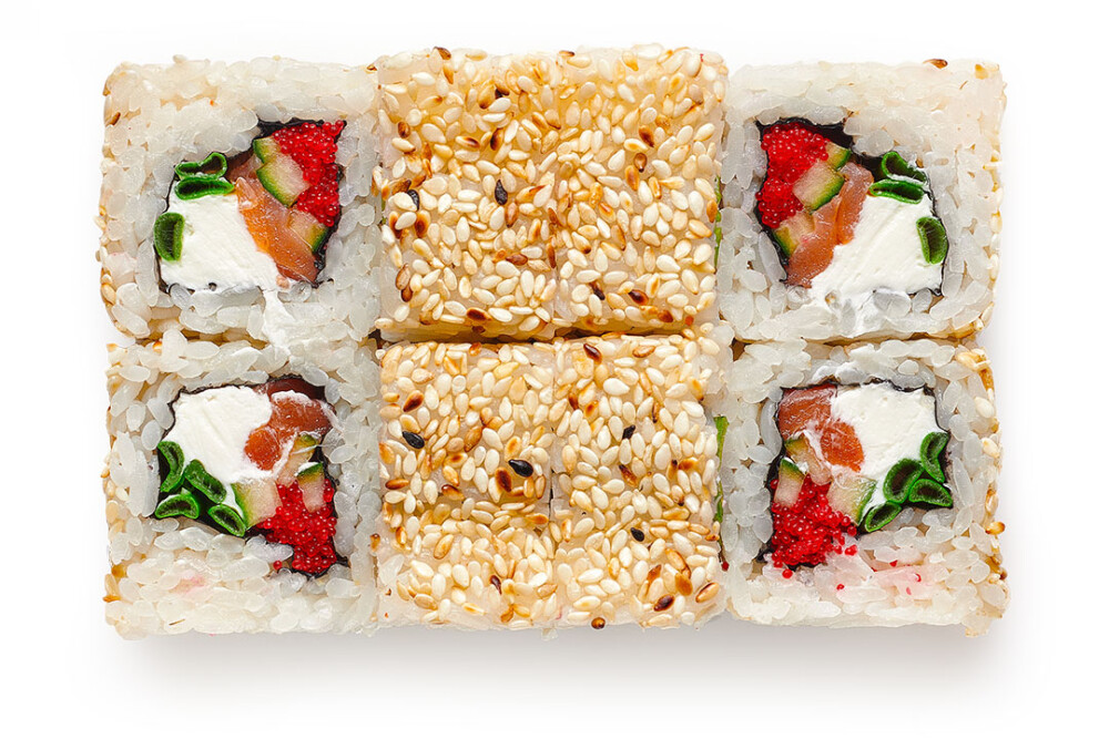 Лосось, икра летучей рыбы, сливочный сыр, огурец, лук зеленый, рис, нори, с верху кунжут белый.