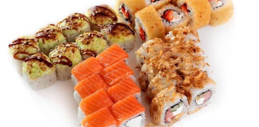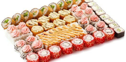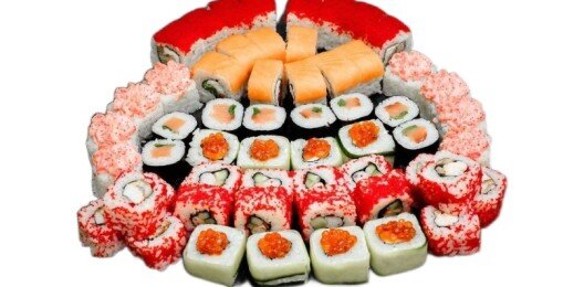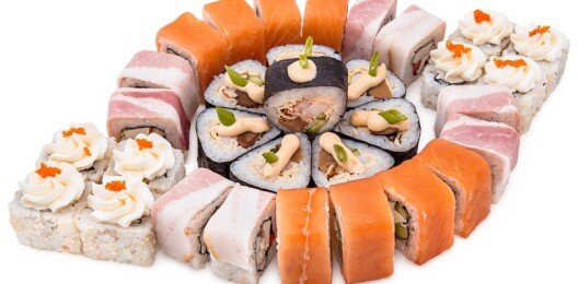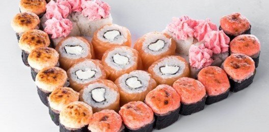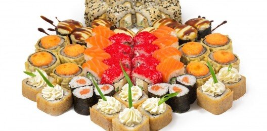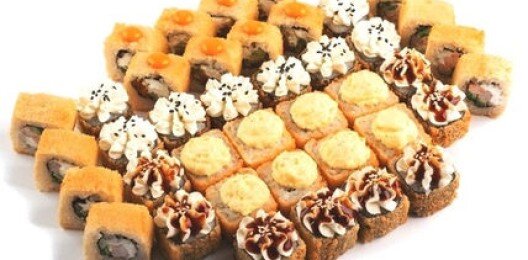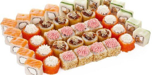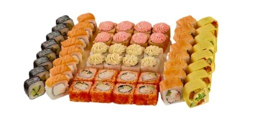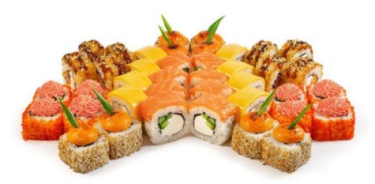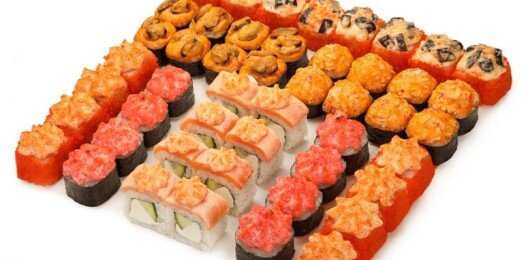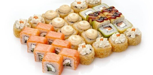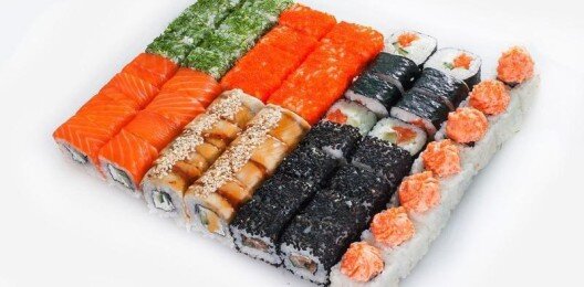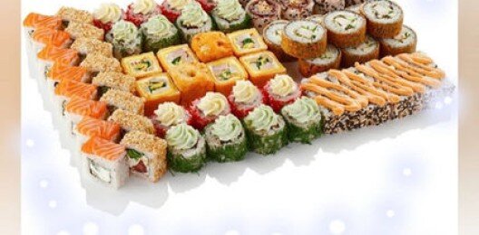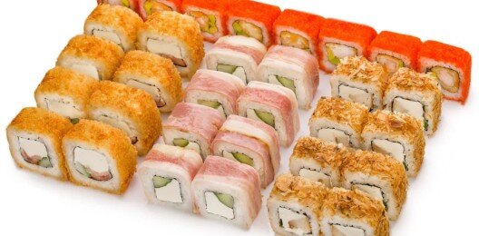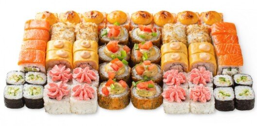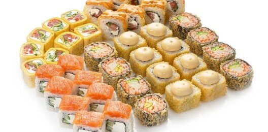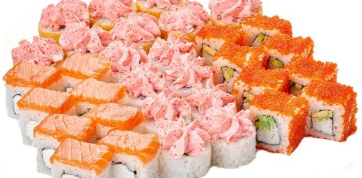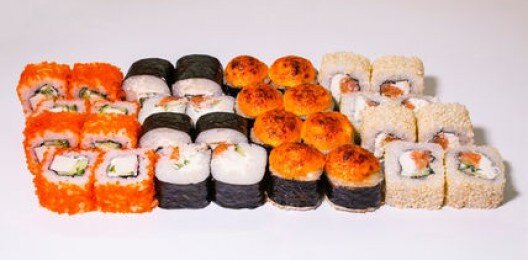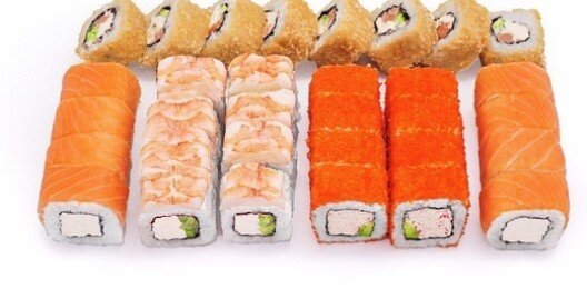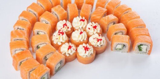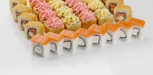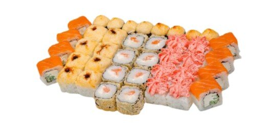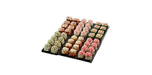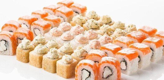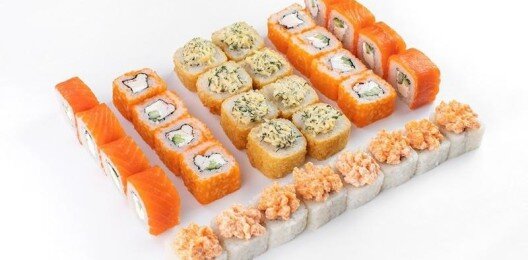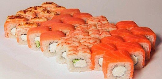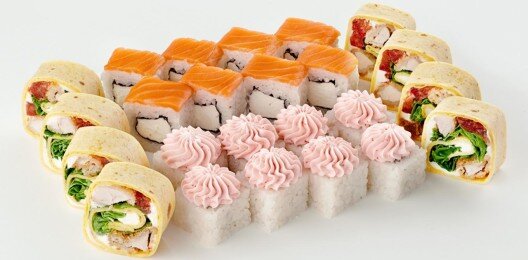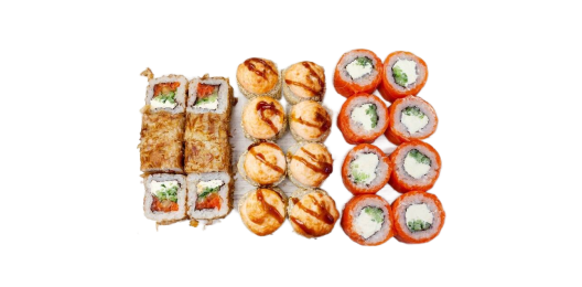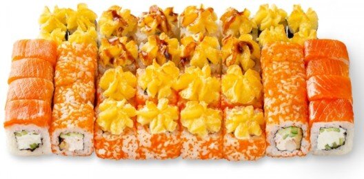 6 роллов, 48 шт. Филадельфия лайт классическая; Калифорния с мясом снежного краба; Лава с лососем; Императорский с курицей; Лава гавайская (мясо снежного краба, курица, ананас, рис, нори, соус лава); Каппа маки.