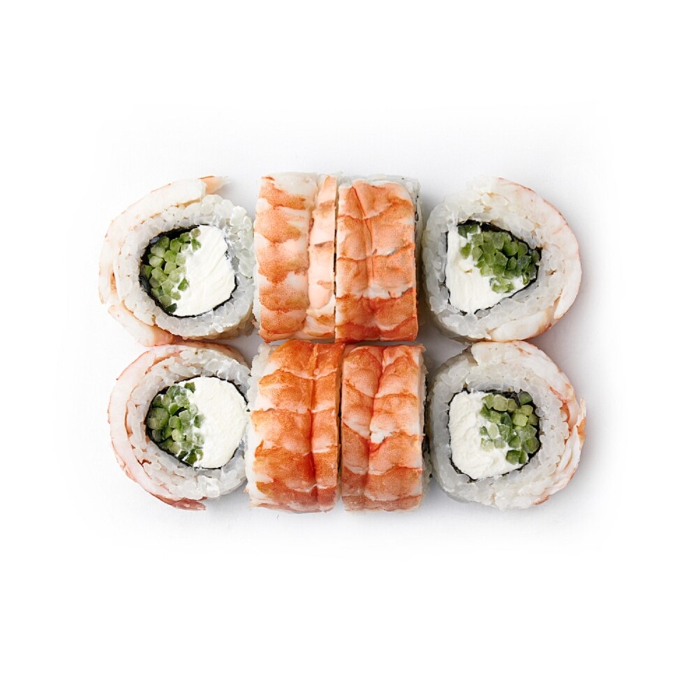 Тигровые креветки, огурец, сыр творожный, рис, нори.