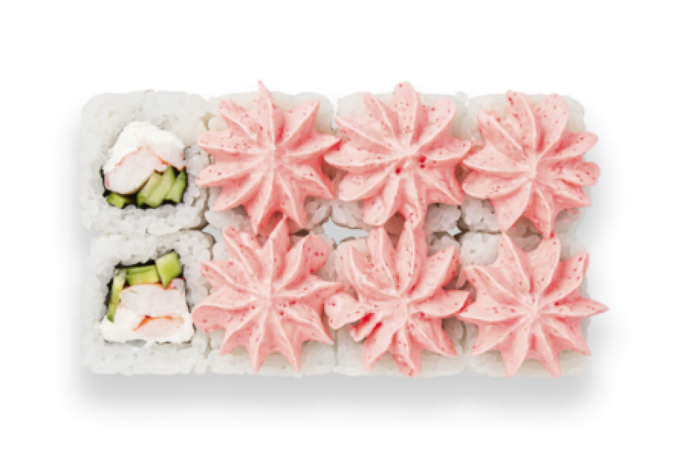Тигровая креветка, сливочный сыр, огурец, соус «Лава», рис, нори.