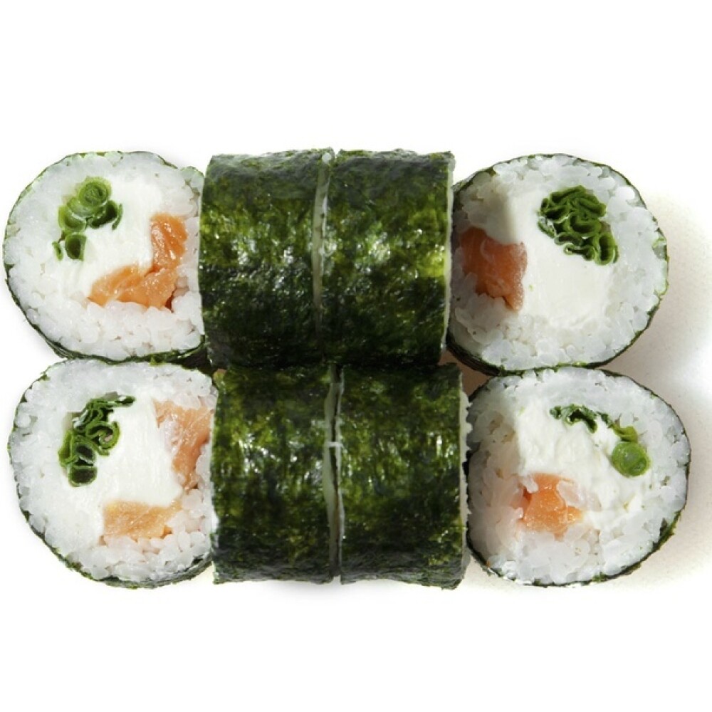 Лосось, сливочный сыр, лук зеленый, рис, нори.