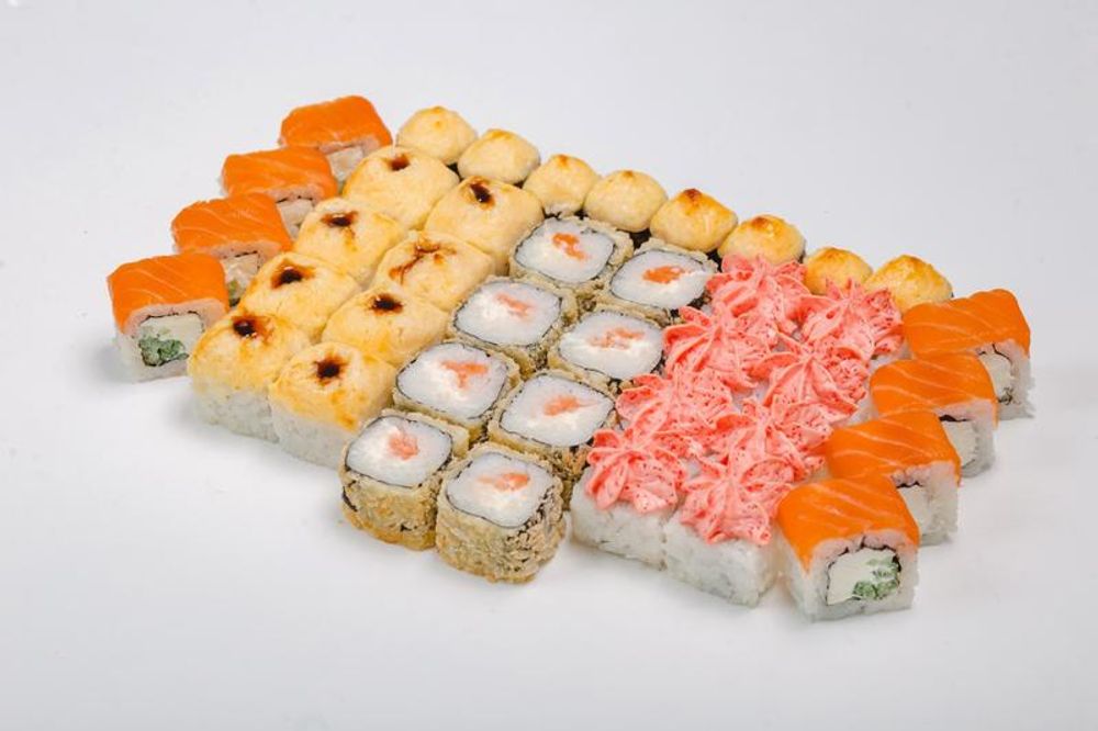 5 роллов, 40 шт. Филадельфия лайт с огурцом, Лава с крабом, Запеченный маки (с тунцом), Запеченный тори (с курицей х/к), Нежный с лососем темпура.