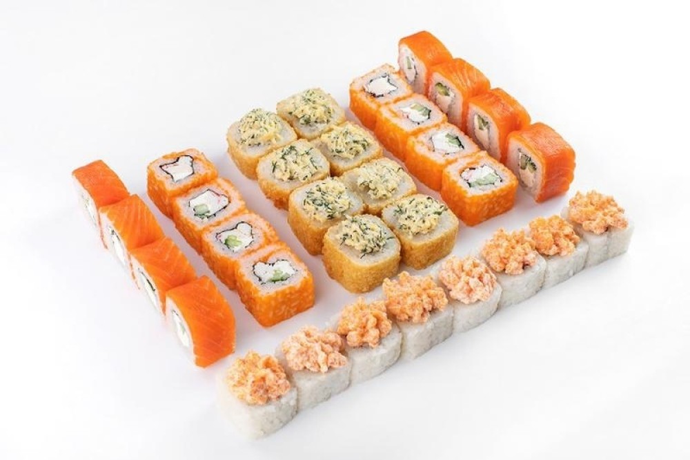 4 ролла, 32 шт. Филадельфия с огурцом, Калифорния с крабом и огурцом, Лава с лососем, Темпура Ролл зимний с курицей х/к.