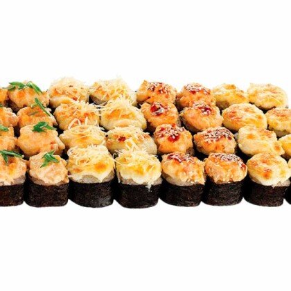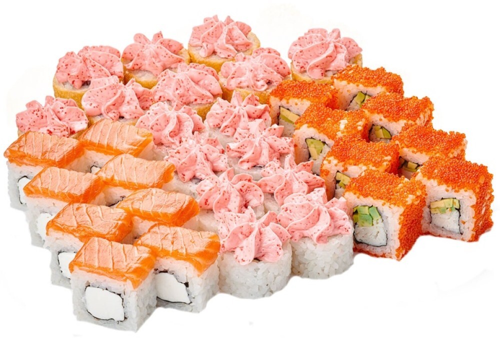 4 ролла, 32 шт. Филадельфия лайт, Лава с лососем, Калифорния с крабом, Тортилья с креветкой и соусом лава.