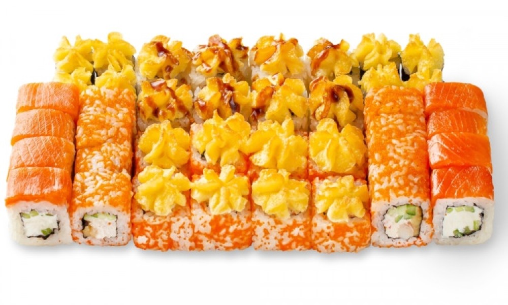 5 роллов, 40 шт. Филадельфия лайт с огурцом, Калифорния с креветкой и огурцом, Калифорния запеченная с крабом, Чикен запеченный с курицей х/к и полит соусом унаги, Запеченный маки с тунцом.