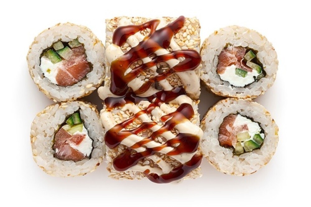 Лосось, сыр творожный, помидор, огурец, соус «Императорский», соус «Унаги», рис, нори, обернут в кунжут белый.